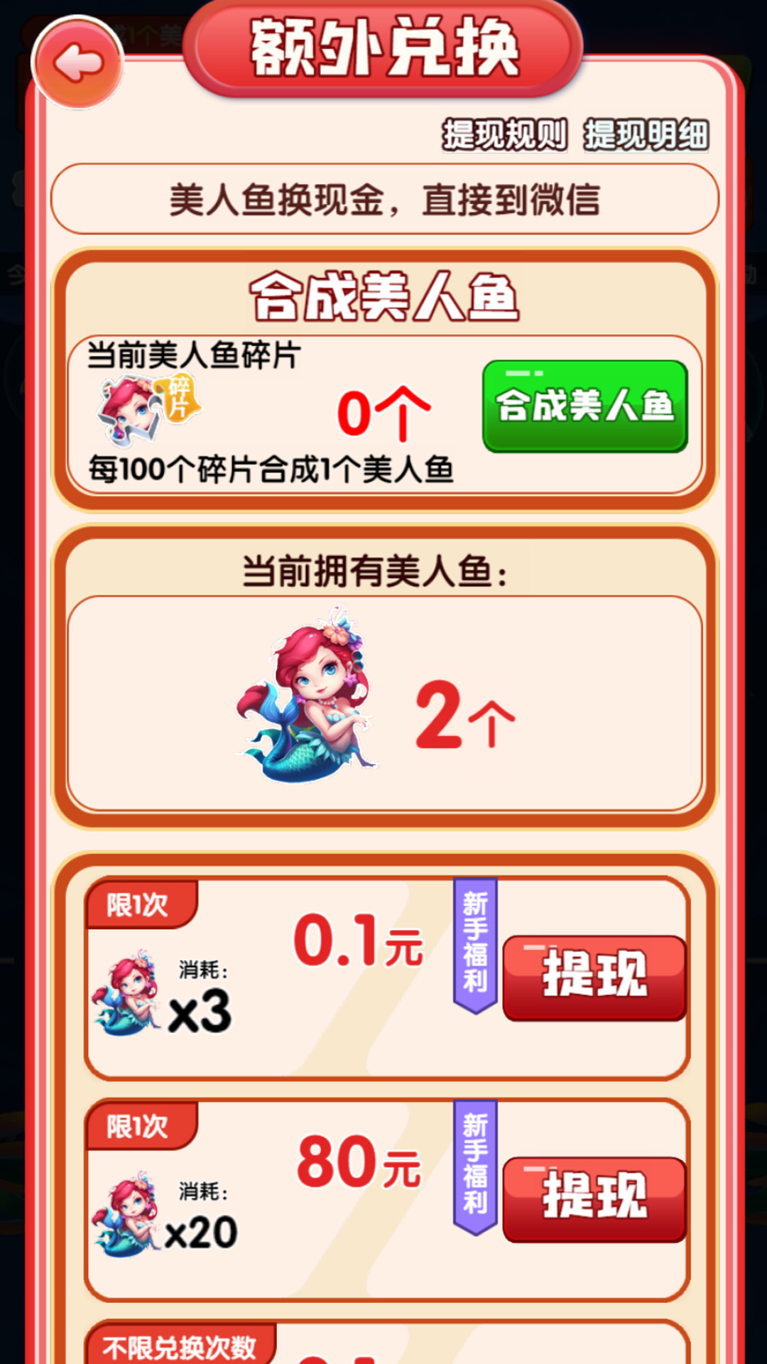 合成最高级的美人鱼,除了红包奖励之外,还可激活我的鱼缸图鉴,可兑换更多红包奖励。随着合成等级的提升,红包奖励的丰厚程度也水涨船高,从最初的惊喜小礼,到后来的豪华大奖,每一次开启都充满了期待与喜悦。