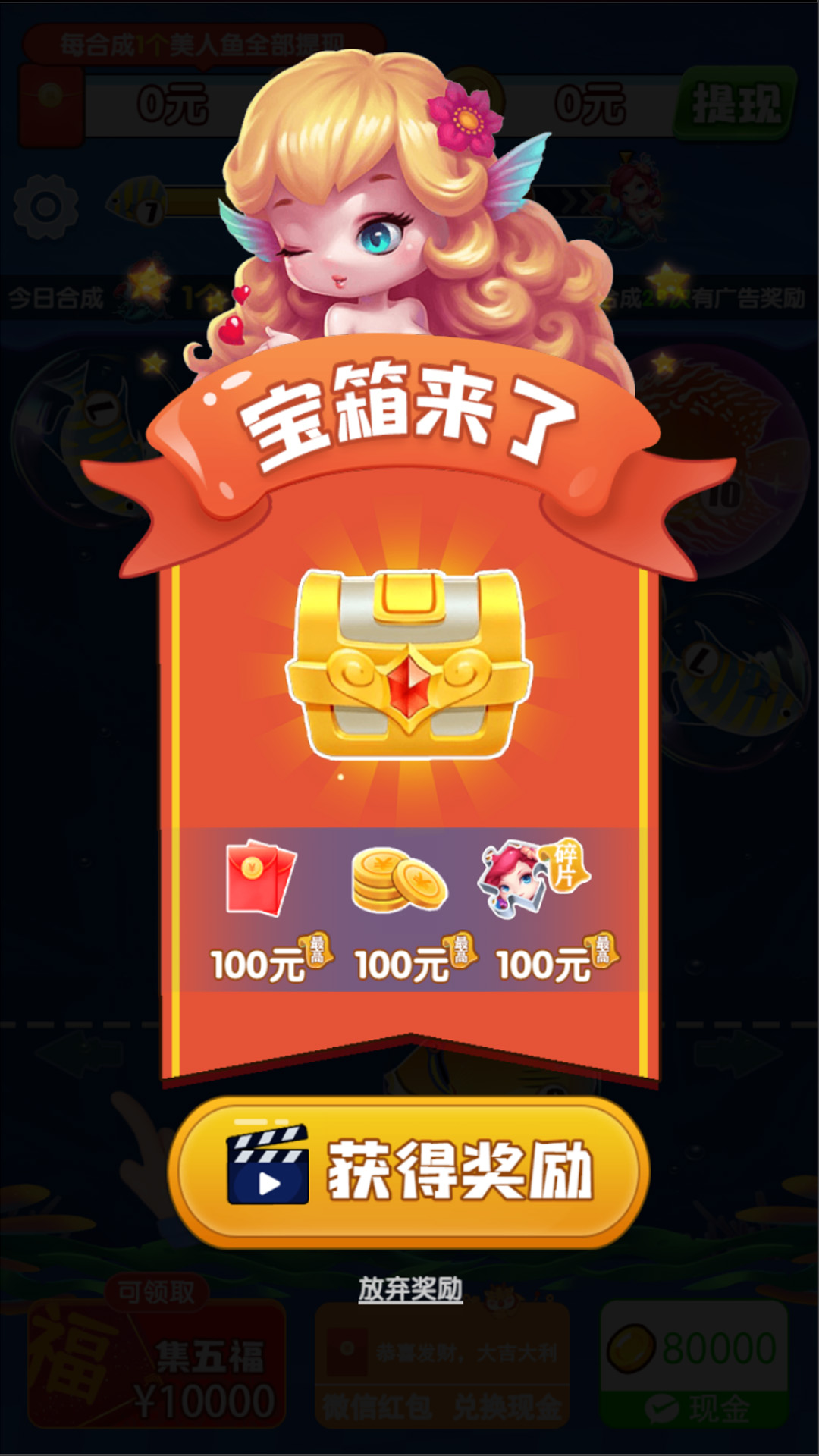 每次合成最高等级的美人鱼,当合成到一定数量后,可领取一“福”字 ,收集的福字越多,可兑换的奖励越丰厚。